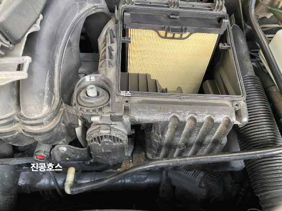 에어박스와 스로틀 바디가 물리는 부분을 잘 넣어주고 볼트와 나사 체결하고, 흡기관 연결하면 다 되었습니다.